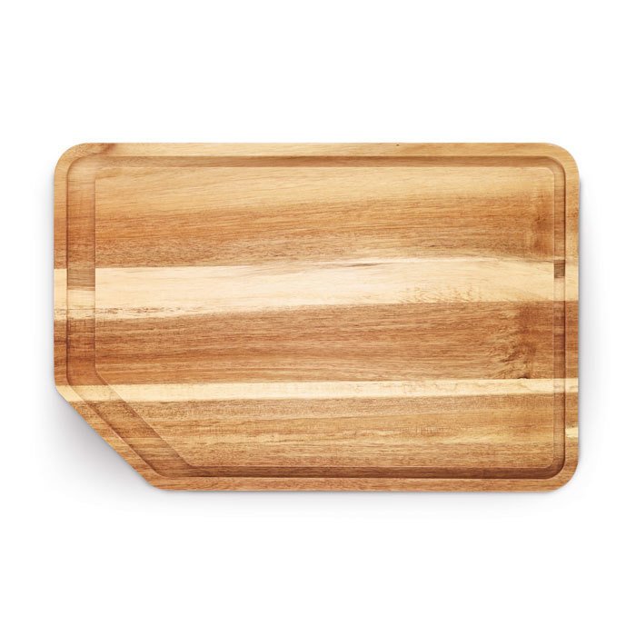 - двусторонние разделочные доски из натуральной древесины акации – имеют исключительно прочную утолщенную конструкцию для максимальной устойчивости в процессе использования и специальные глубокие желобки, которые собирают и надежно удерживают сок во время нарезки, не позволяя ему стекать с доски. Вторая сторона изделий имеет плоскую поверхность и предназначена для подачи блюд к столу.