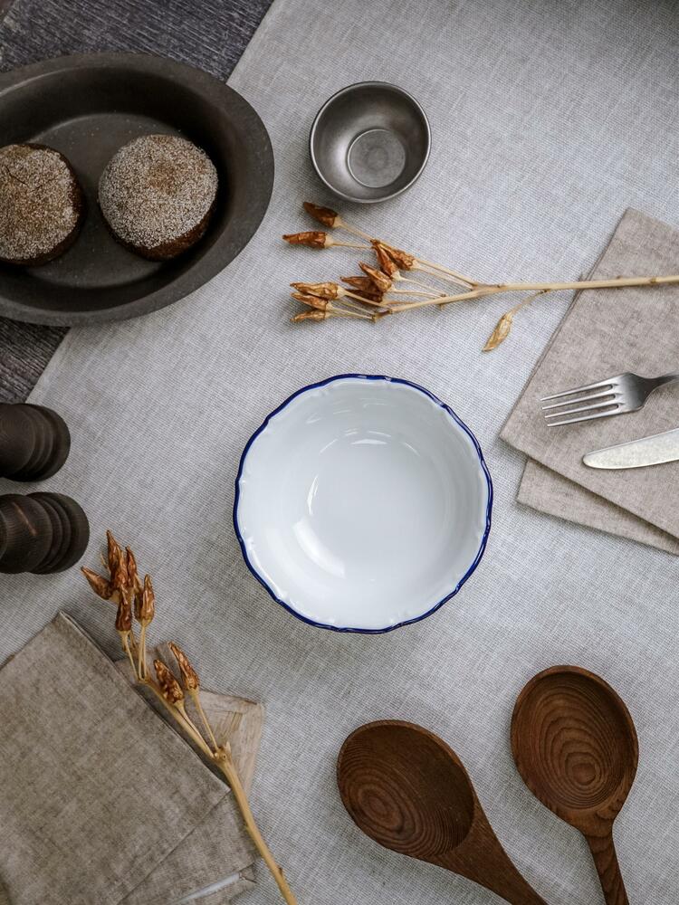 Коллекция Maria Blue от компании Porland включает элегантные блюда, тарелки, салатники, чайные чашки, блюдца, а также другую столовую посуду и предметы сервировки, изготовленные из высокопрочного белоснежного фарфора с глянцевым глазурованным покрытием. Изделия имеют лаконичные классические формы со слегка волнистыми краями, изящный рельефный декор и тонкую окантовку насыщенного синего цвета, благодаря чему идеально подходят для создания изысканной сервировки. Посуда Maria Blue отлично сочетается с любым декором, будь то яркая скатерть или сервировочные салфетки в спокойных тонах, и органично вписывается в любой интерьер, придавая ему благородный вид. Можно разогревать в микроволновой печи и мыть в посудомоечной машине.