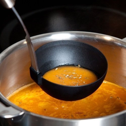 Половник с нейлоновой чашей абсолютно гигиеничен и никогда не поцарапает антипригарное покрытие. Его размер обеспечивает идеальное порционное разливание первых блюд по тарелкам. Им также удобно разливать по банкам компоты и варенье.