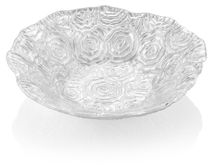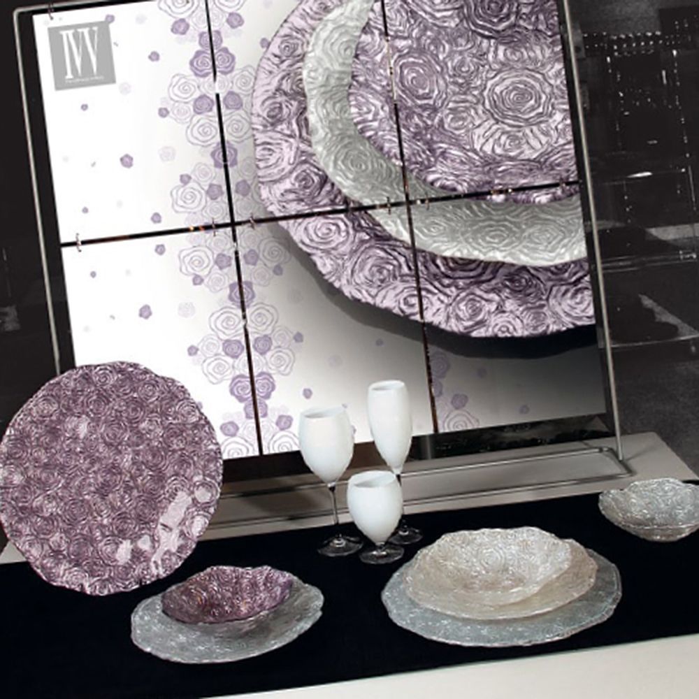 Романтичная серия в нежно-сиреневых и жемчужно-белых тонах станет украшением любого стола. Интересная гравировка стекла, выполненная вручную, в виде изящных розочек порождает очень красивую игру света. Коллекция Roseto – отличный выбор для тех, кто предпочитает окружать себя эффектными и изящными аксессуарами.